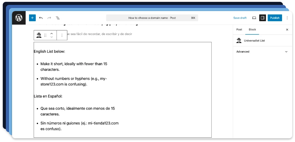Write bullet lists in both languages. Universalist handles the language detection and switching so your content stays clear and accessible.