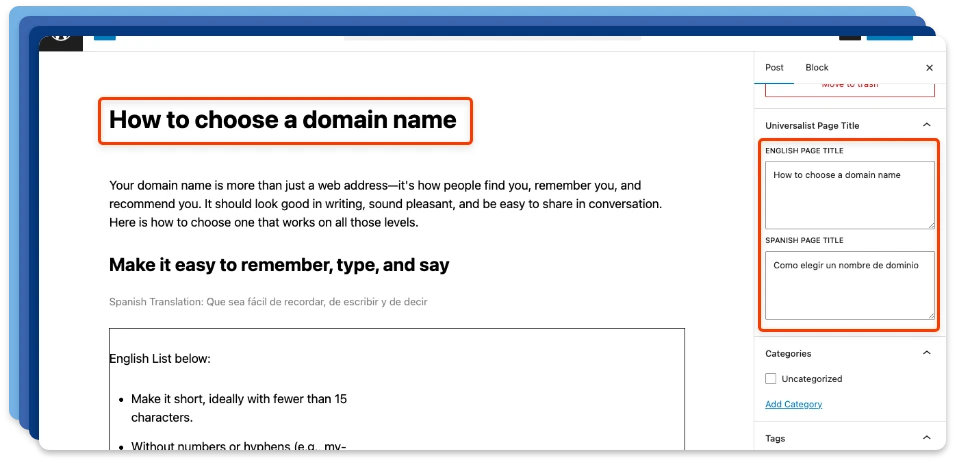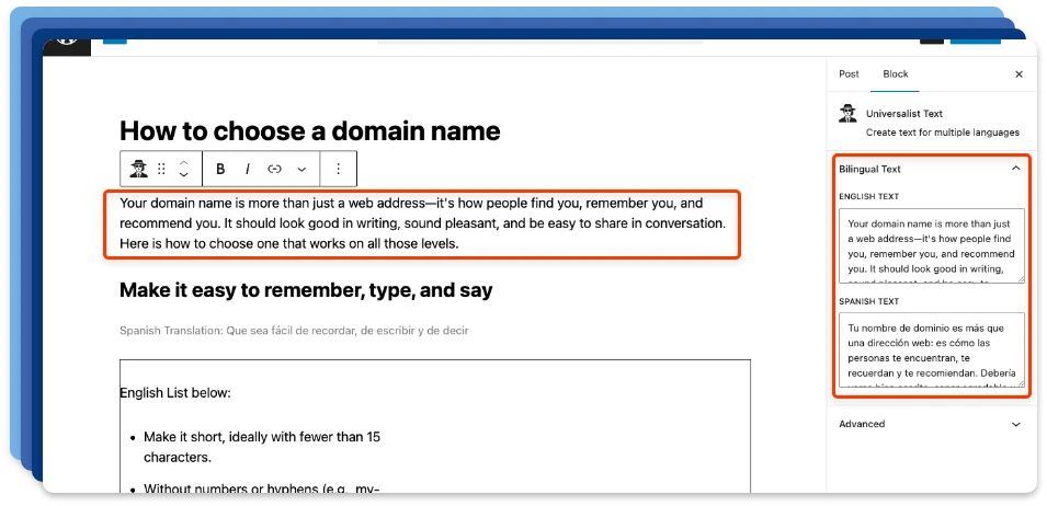 Create H1, H2, and other headings in both languages. Universalist displays the correct version instantly, keeping your content structure clean and SEO‑friendly.